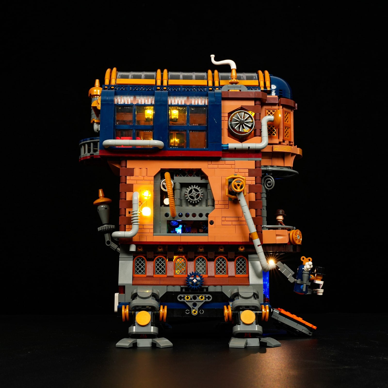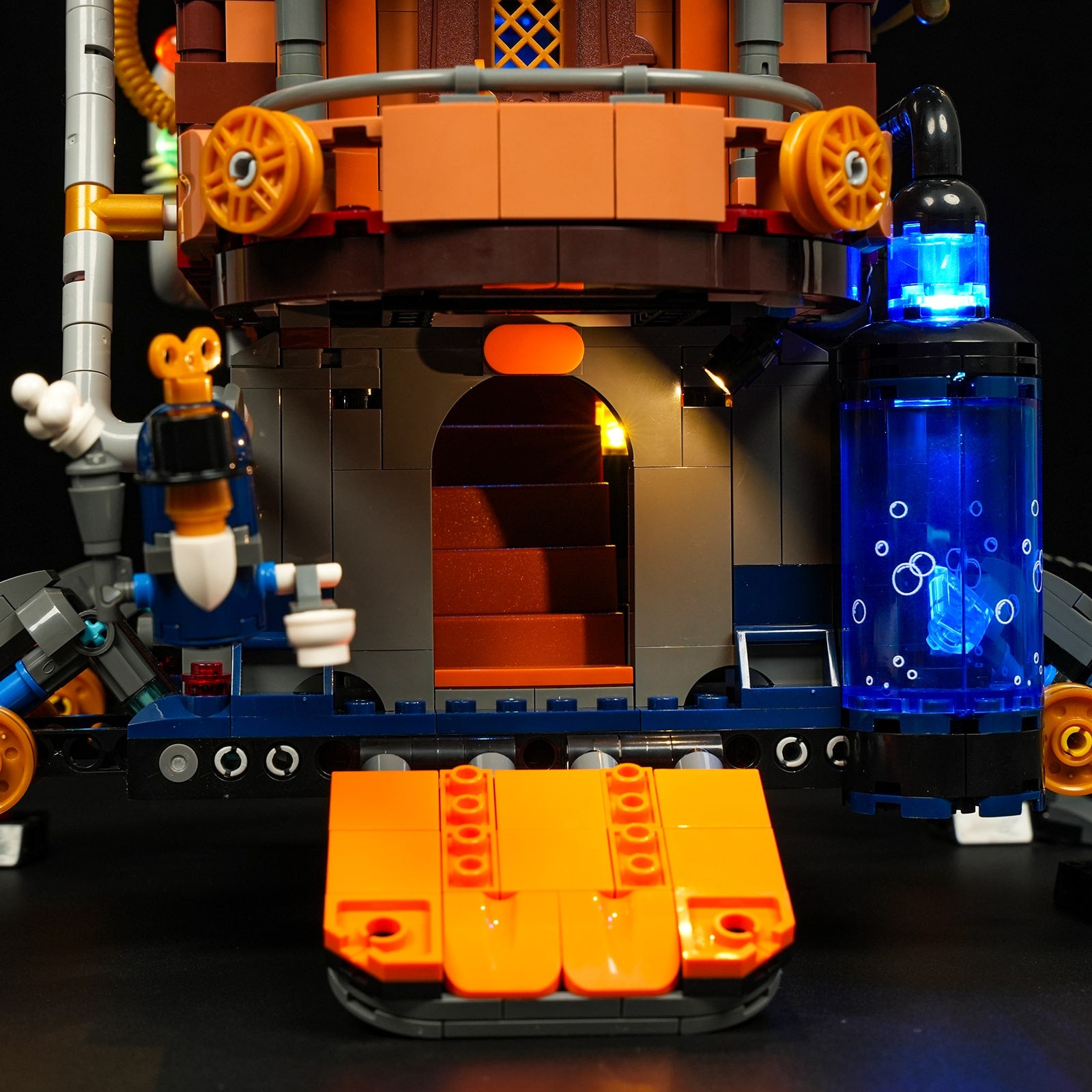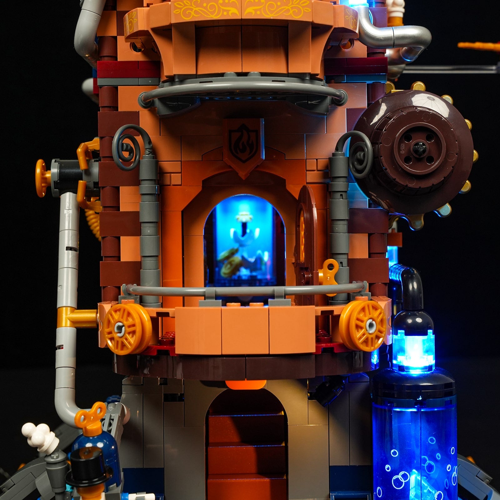 The set features numerous unique elements—colorful glowing test tubes, mechanical gatekeepers, mechanical birds, and more—to create a complete steampunk world.