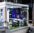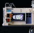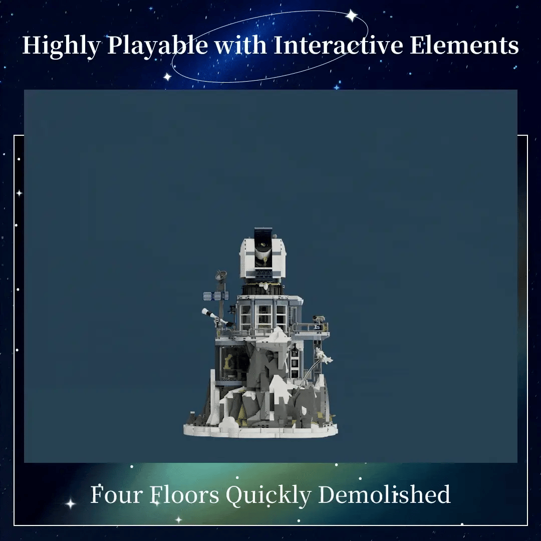 1. The top observatory rotates 360° to reveal an optical telescope. The telescope extends and adjusts vertically.
