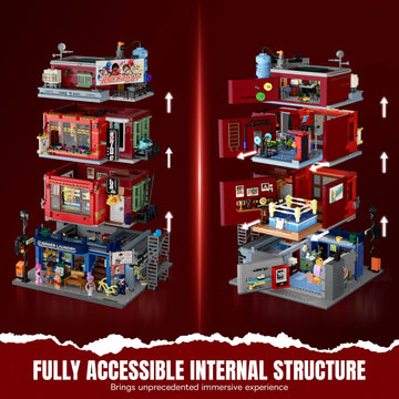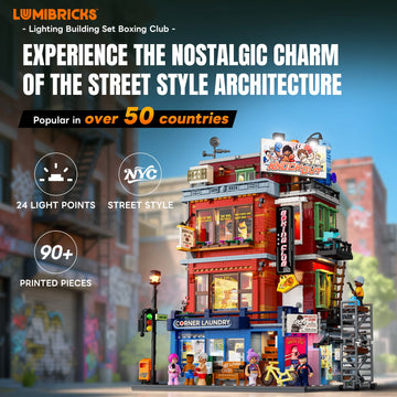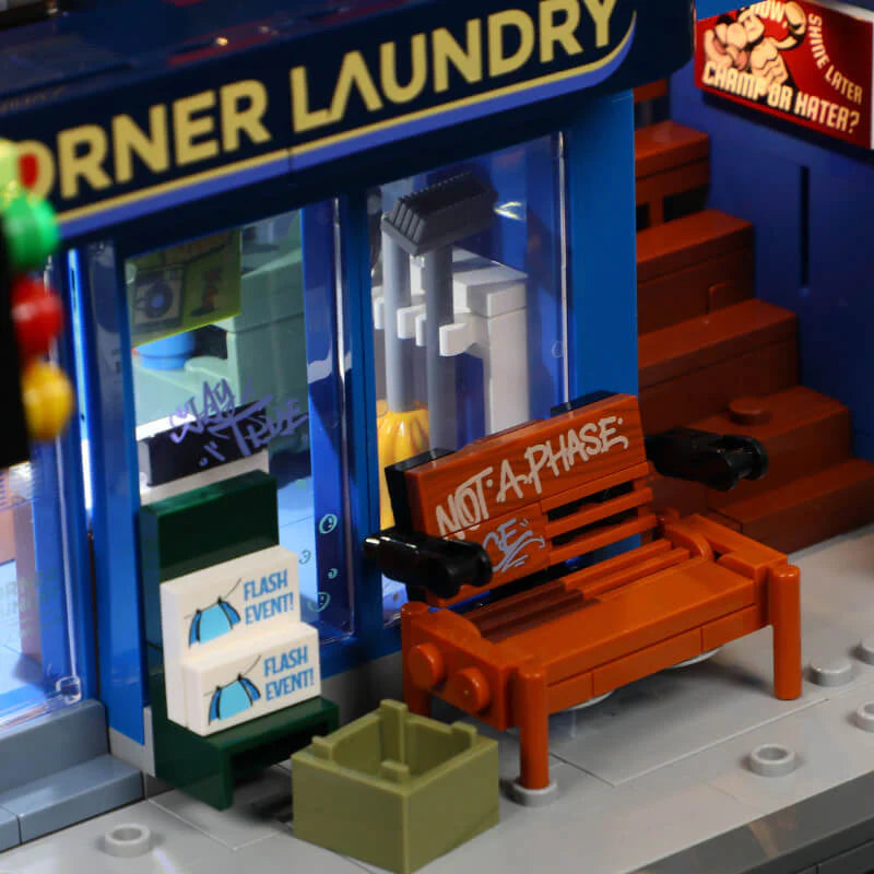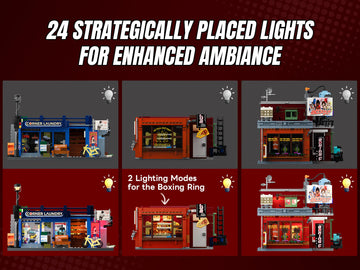 The set features 24 dynamic light points and a translucent exterior design. When lit up, it transforms into a vibrant neon-lit street scene.