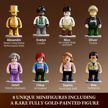 The set includes 8 diverse figures, from a gold-painted collector to a gelato shop clerk, adding character and storytelling to your gallery scenes.