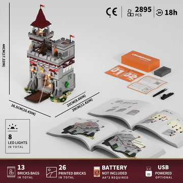 The product includes building blocks 2895PCS, 13 bricks bags, 26 LED lights and 2 clear assembly guides.