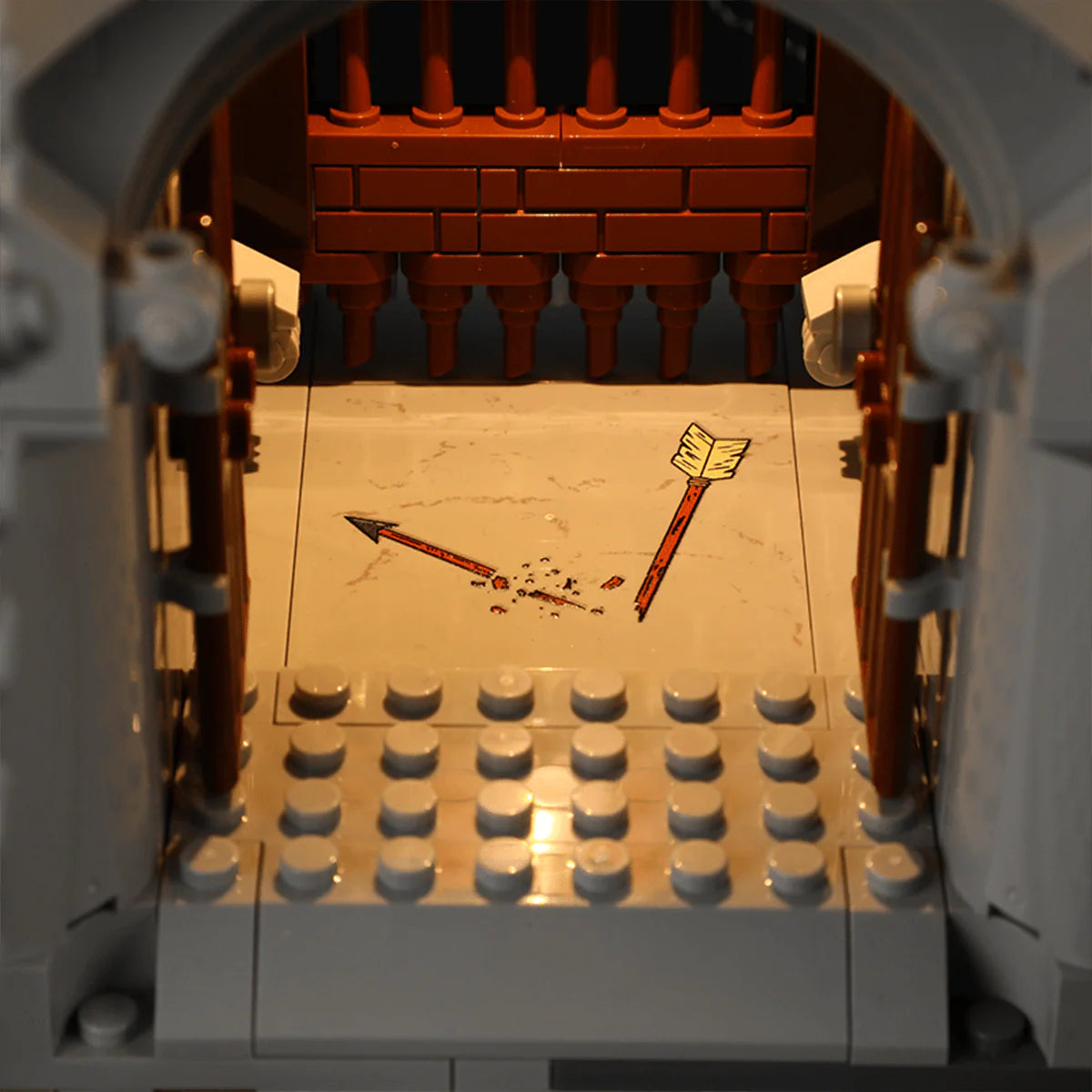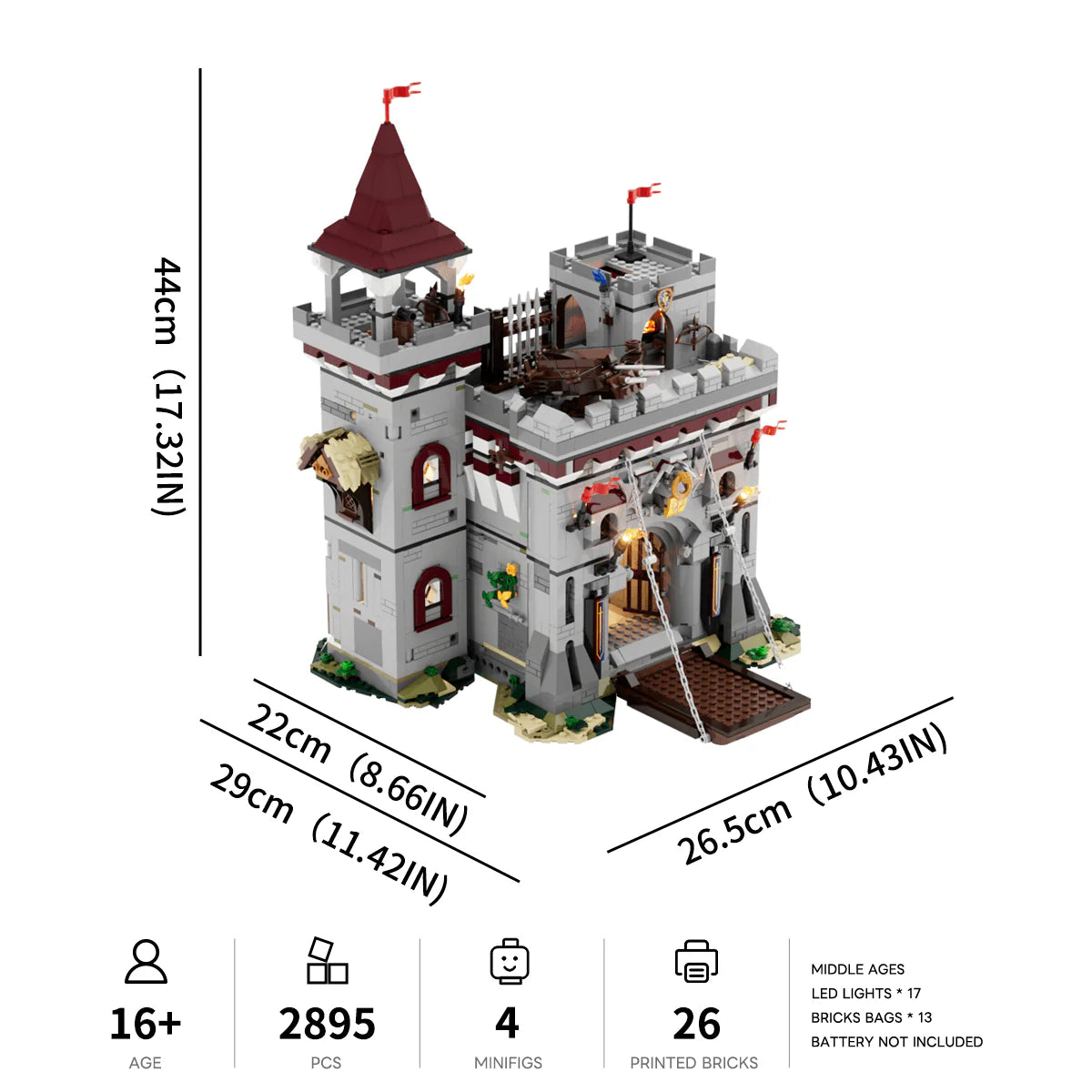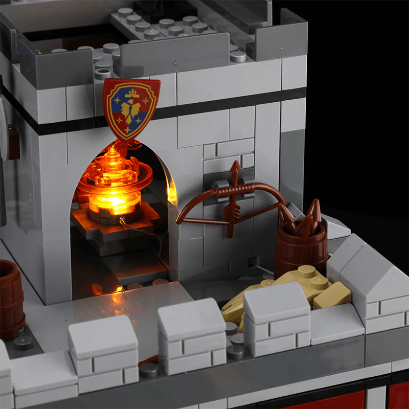 Equipped with 8 light points and 5 light strips, powered by either 3× AA batteries or via USB, it glows with ambient medieval lighting to highlight its defensive and storage spaces.