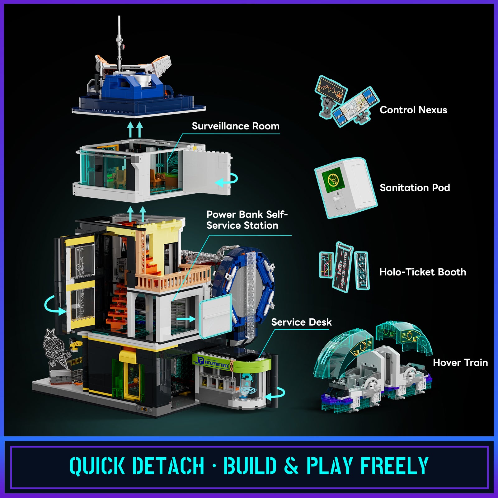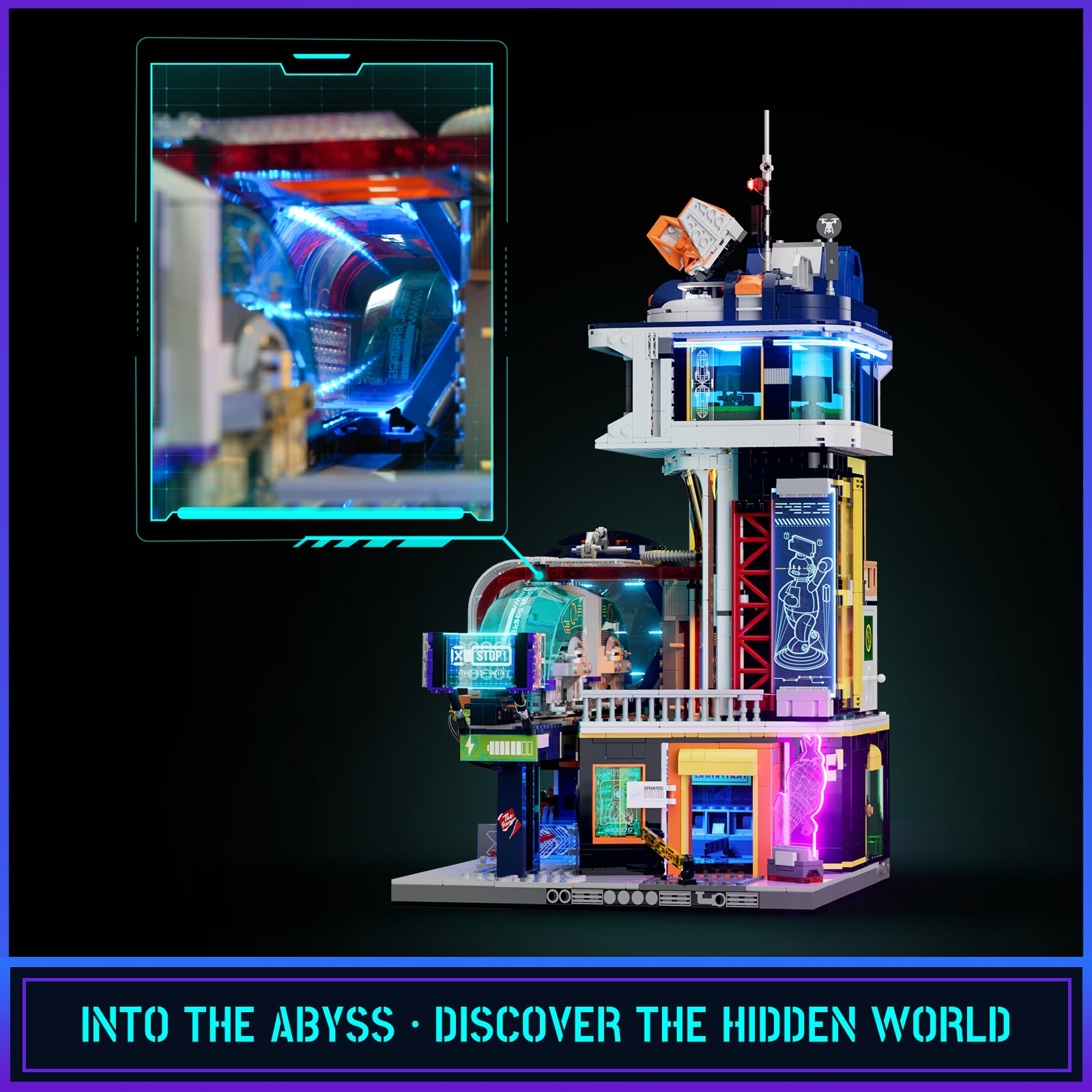 “Spatial Jump Portal” tunnel: an optical illusion effect inside the station to simulate infinite train tracks.A full LED lighting kit: 24 light points providing neon, holographic billboard and back‑lit effects for dramatic ambience.