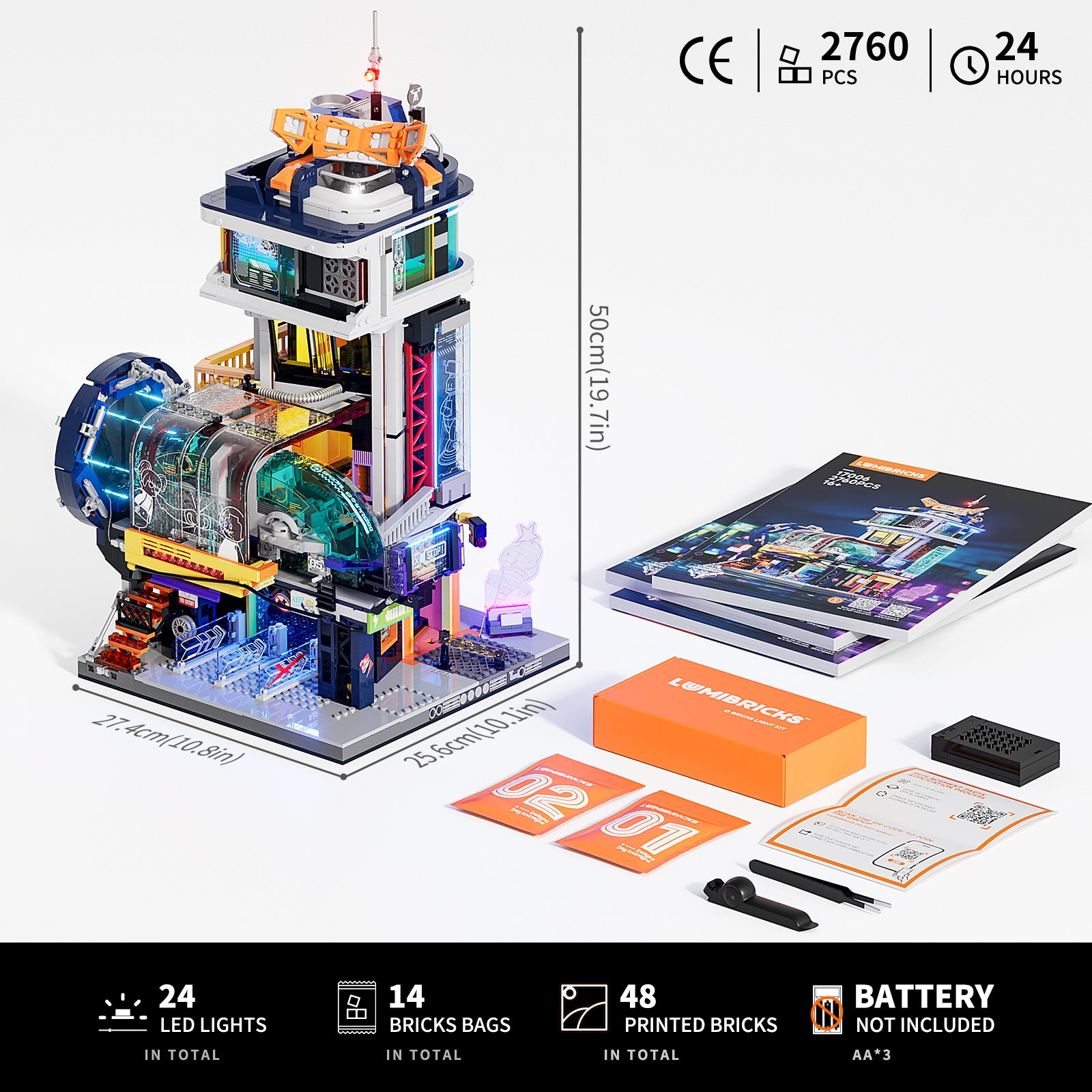 The product includes building blocks 2760PCS, 14 bricks bags, 24 LED lights and 3 clear assembly guides.