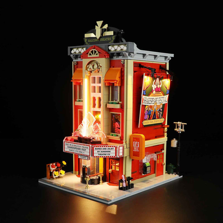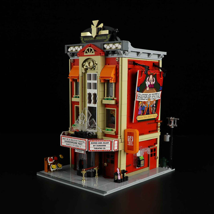The set includes a unique light kit that illuminates the stage and seating areas, creating a warm, theatrical ambiance.