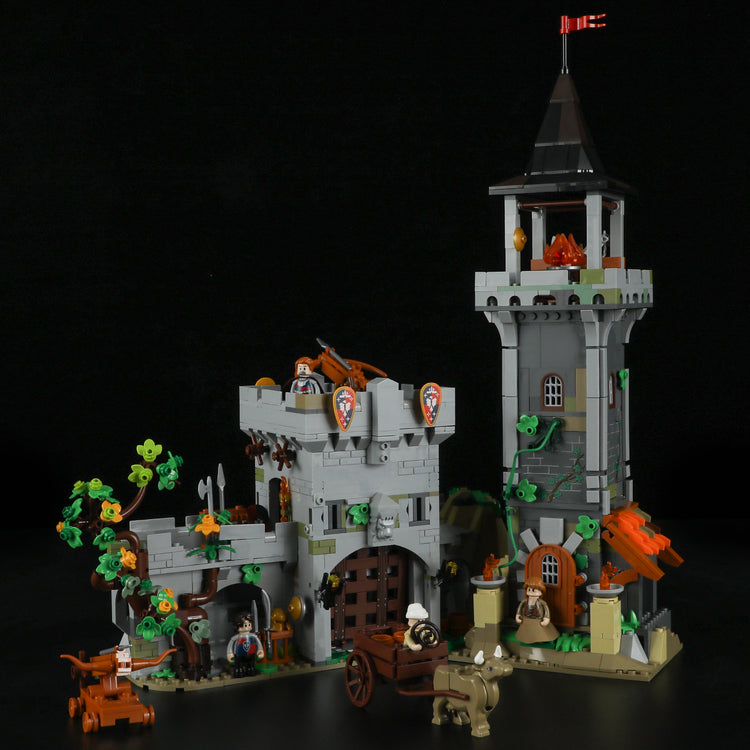Experience the grandeur of the medieval watchtower, featuring a sturdy city gate and towering tower. Enclosed within its walls, discover 10 illuminated spots, such as torches lighting the path by the gate. At night, a bonfire atop the tower casts a warm glow inside. The set includes 4 minifigures, an ox-pulled cart, and a defensive crossbow, creating a peaceful medieval town scene.