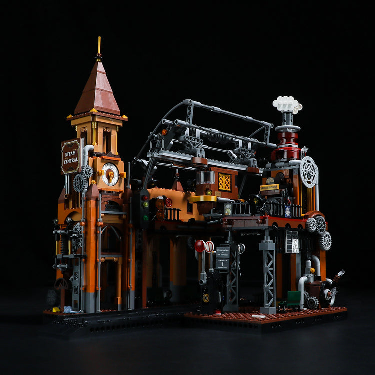 This set captures the essence of a bustling train station with detailed architecture, vintage gears, and industrial-inspired elements.