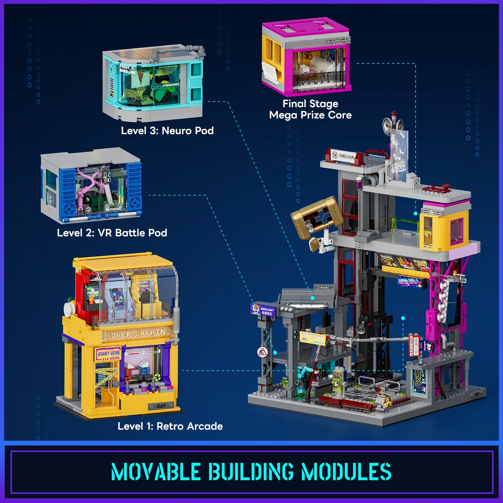 Multiple interchangeable modules for play & display: retro arcade area, VR‑combat pod, brain‑computer interface pod, mystery prize pool module.