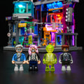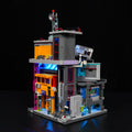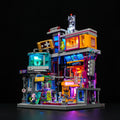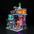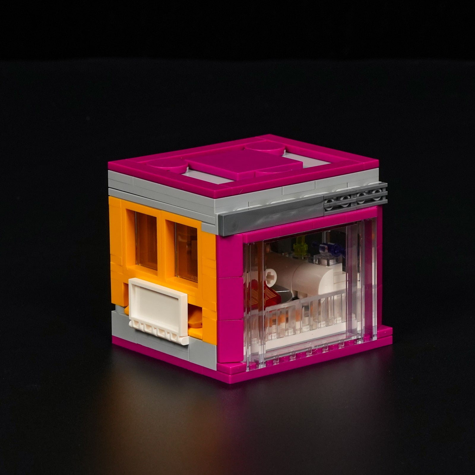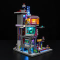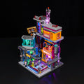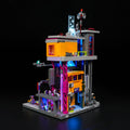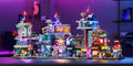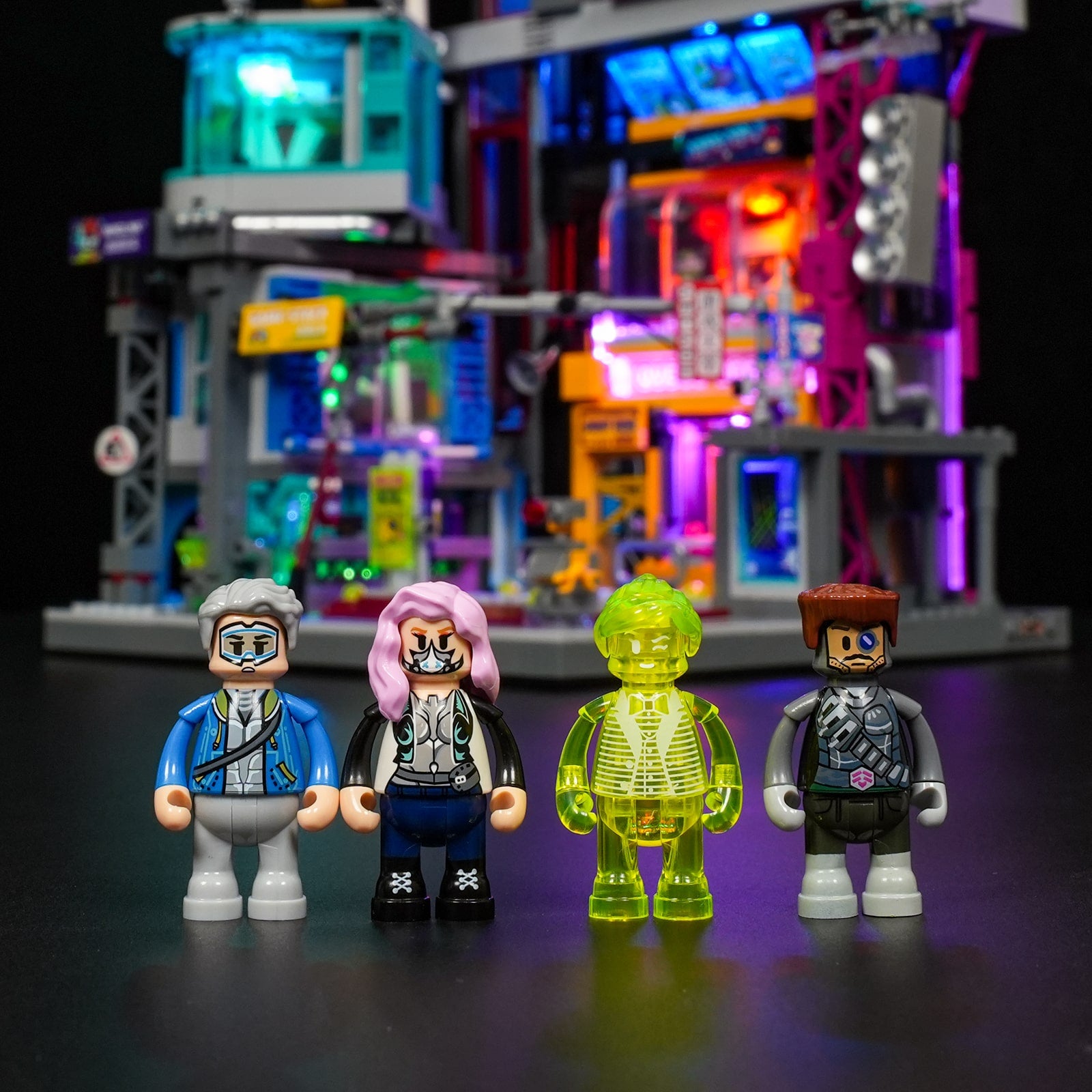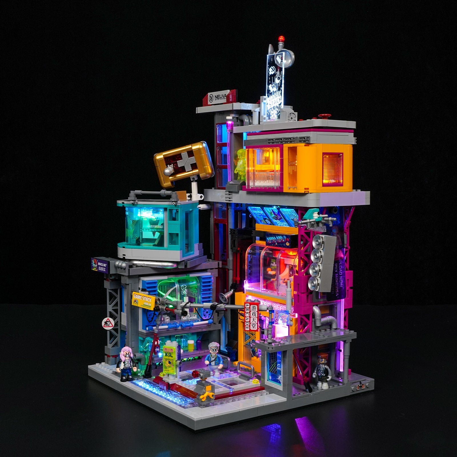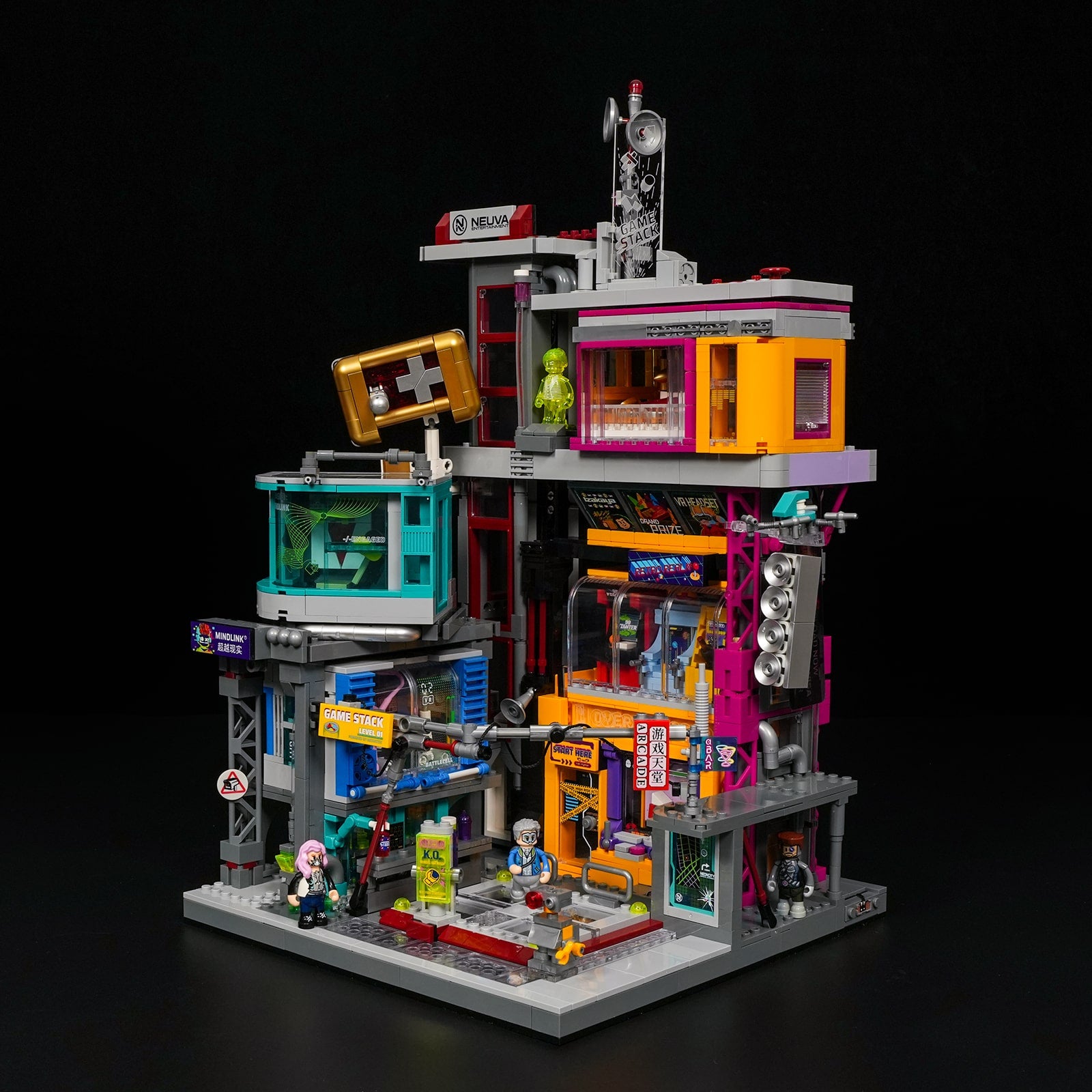 One set to conquer the entire neighborhood. Inspired by cyberpunk's stacked philosophy and drawing from the architectural language of Metabolism, this neon-drenched cityscape features a vertically growing “entertainment district.”