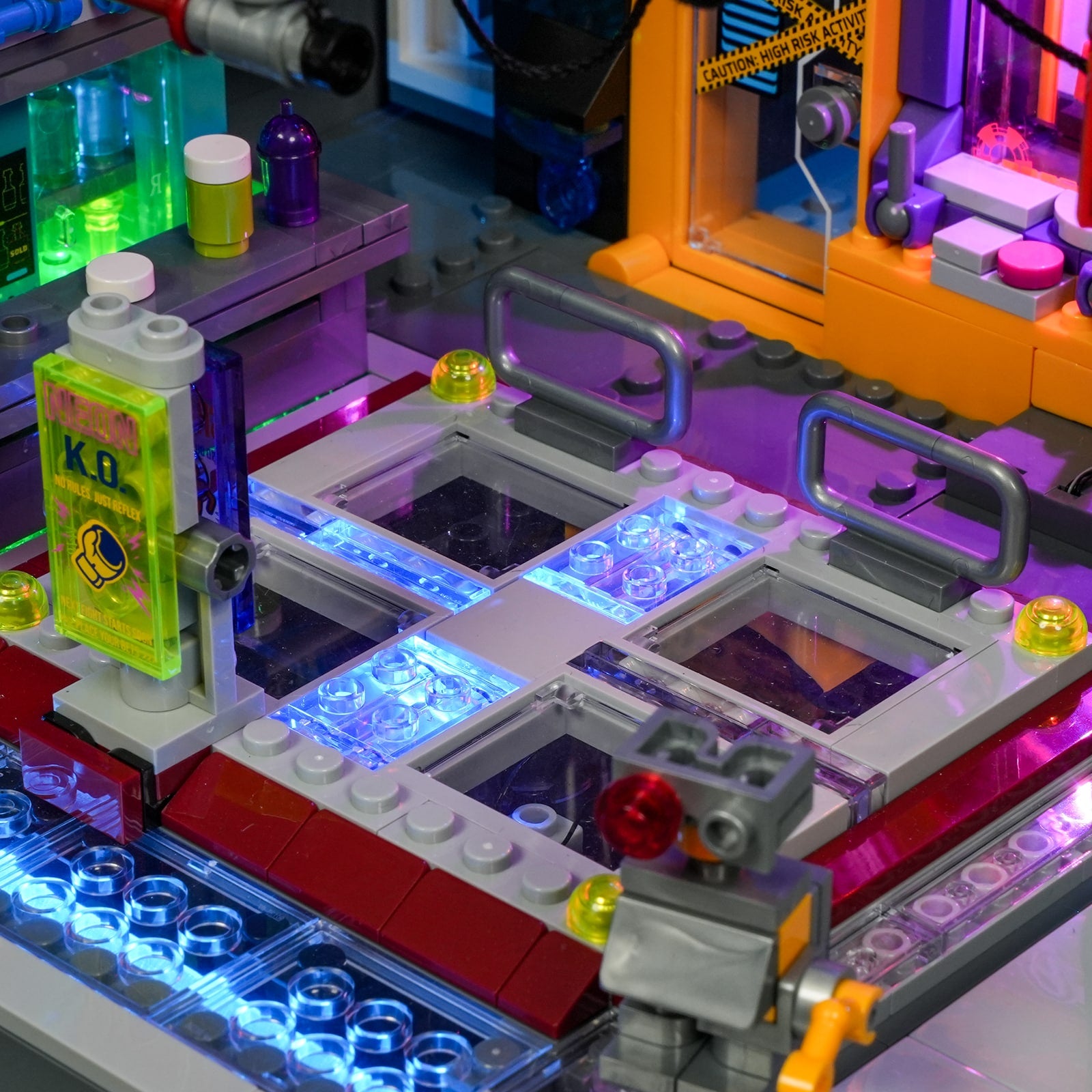 23 light points including flashing acrylic panels, rotating floor lights, LED strips that mimic illuminated billboards — delivering a dynamic glow that transforms when the lights go down.