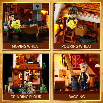 There are 7 lighted positions in this set. There is 1 light in front of the door and 1 light outside the door, so that the water wheel drive of the mill is combined with the light. The dynamic effect of the turning waterwheel can be felt through the intermittent lighting. In addition, 2 ice-blue light points are placed on the water next to the mill creating a quiet atmosphere of the medieval countryside at night.