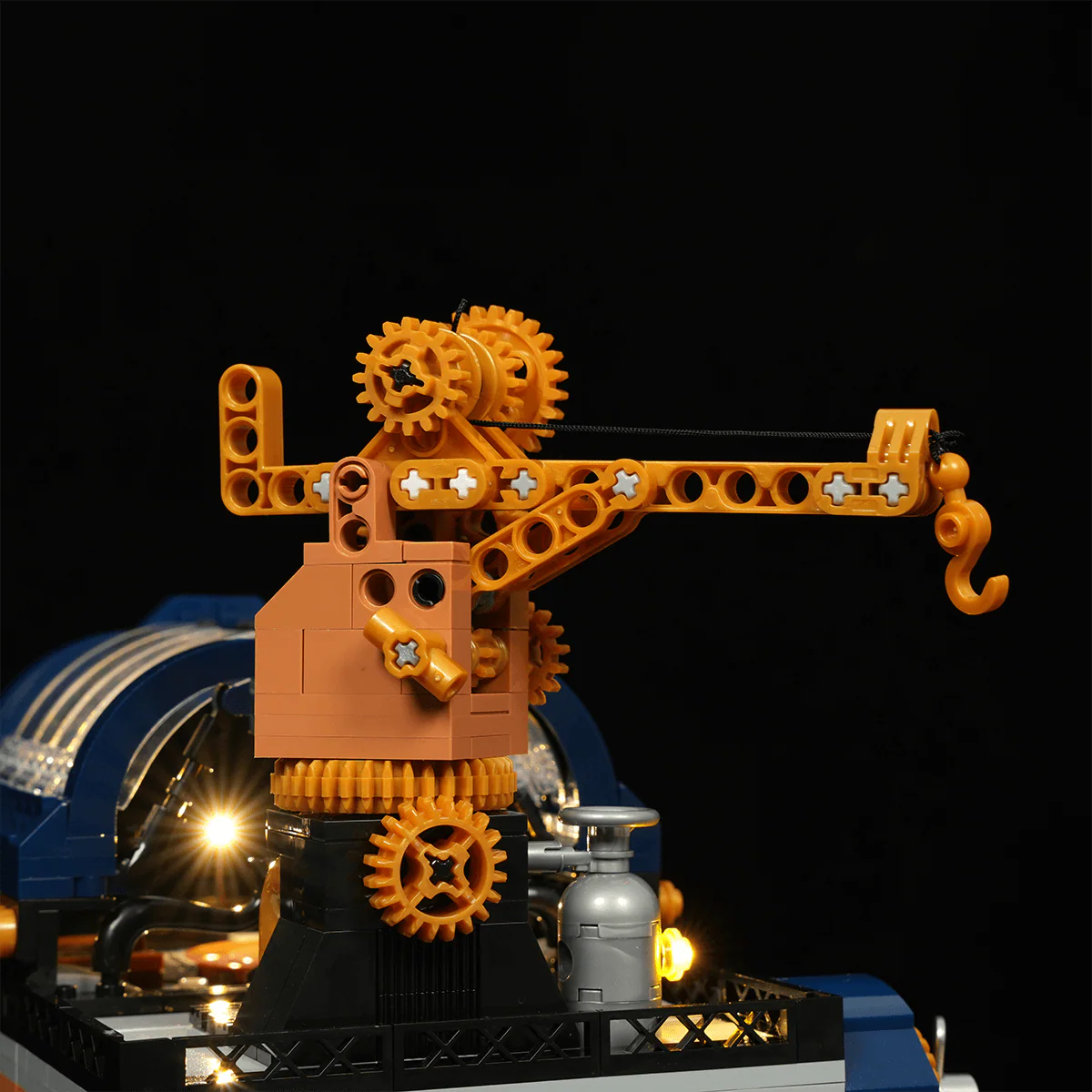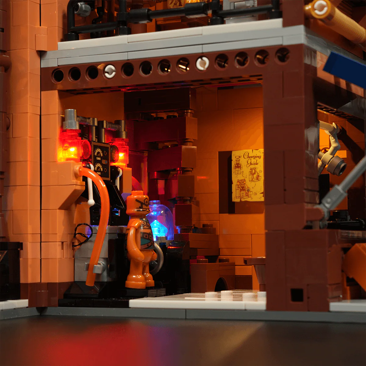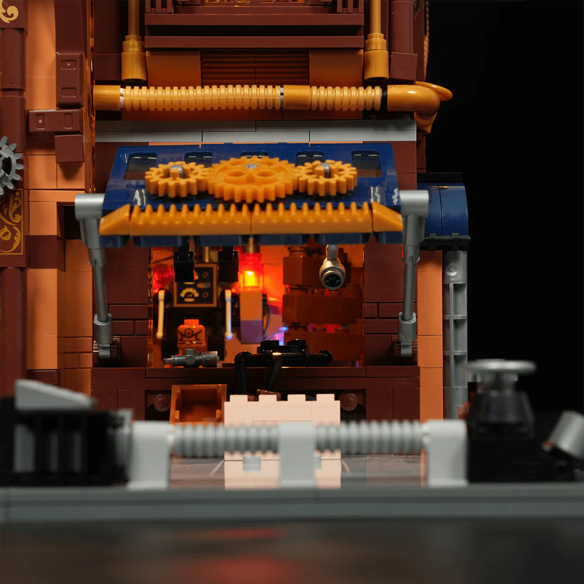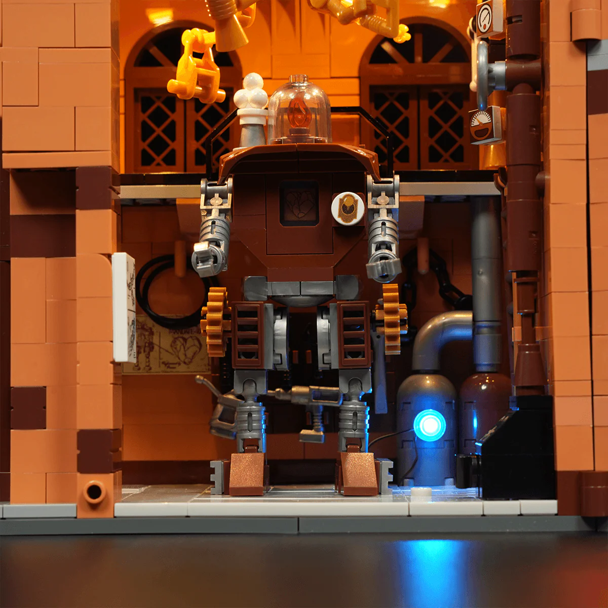 Building upon steampunk-inspired retro lighting, this interactive display features dynamic effects triggered by model assembly and minifigure interactions.