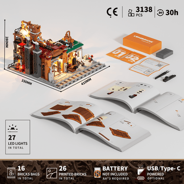 The product includes building blocks 3138PCS, 16 bricks bags, 27 LED lights and 2 clear assembly guides.