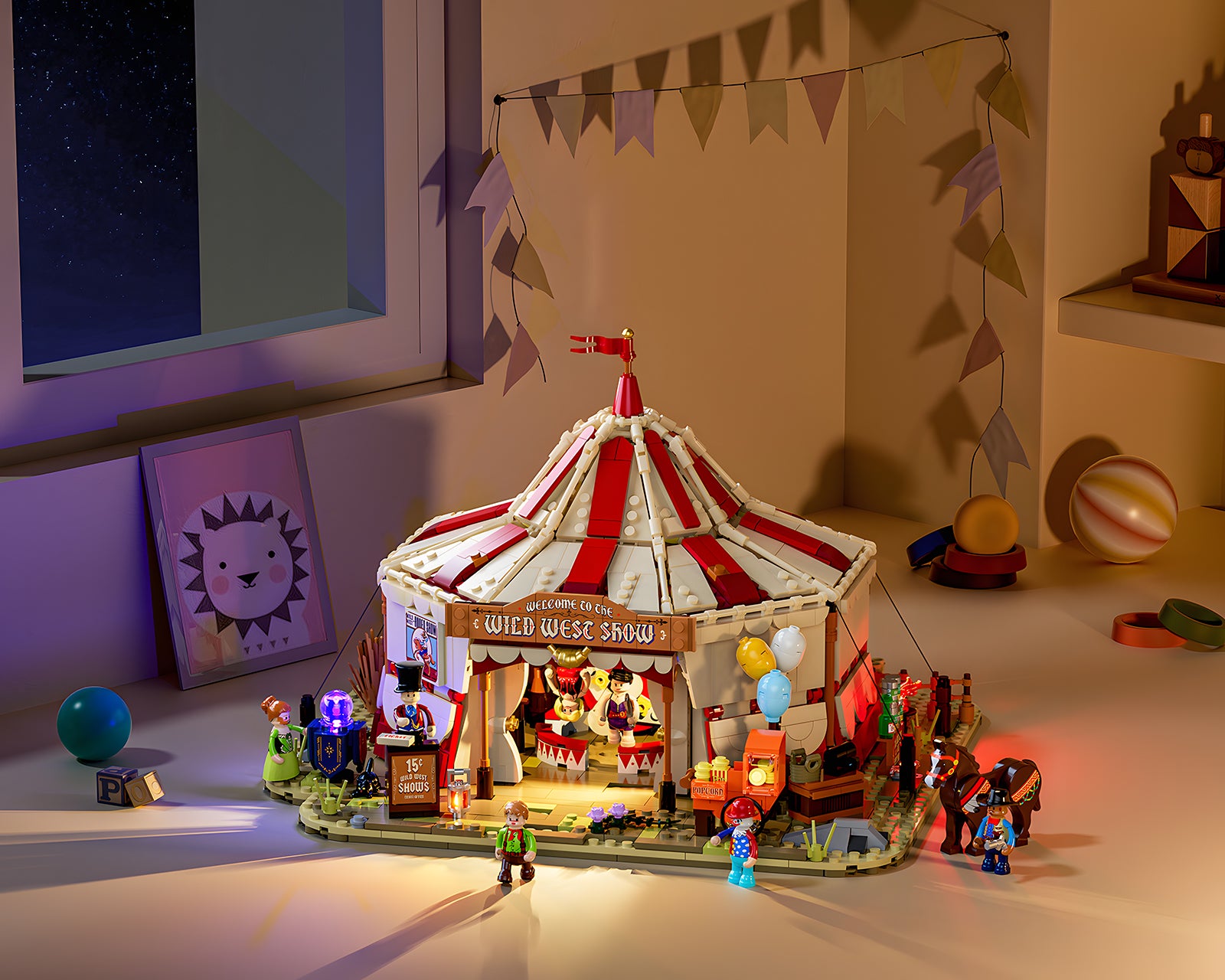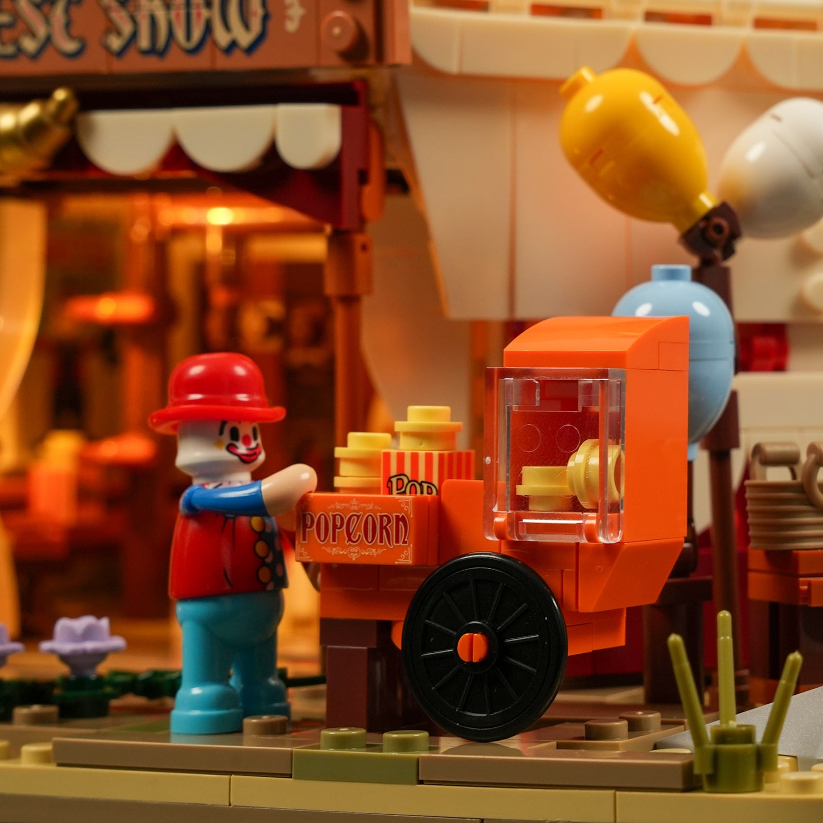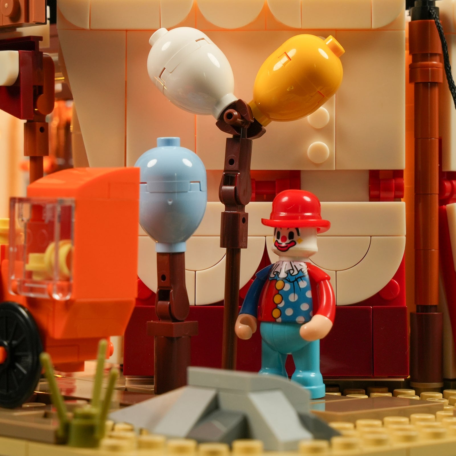 Featuring 1,962 pieces and 7 integrated LED light points, the circus comes alive with a warm glow that highlights every scene—from the bustling main stage to the detailed backstage areas. The semi-open structure allows easy access, so you can arrange mini-figures, props, and performances just the way you like.