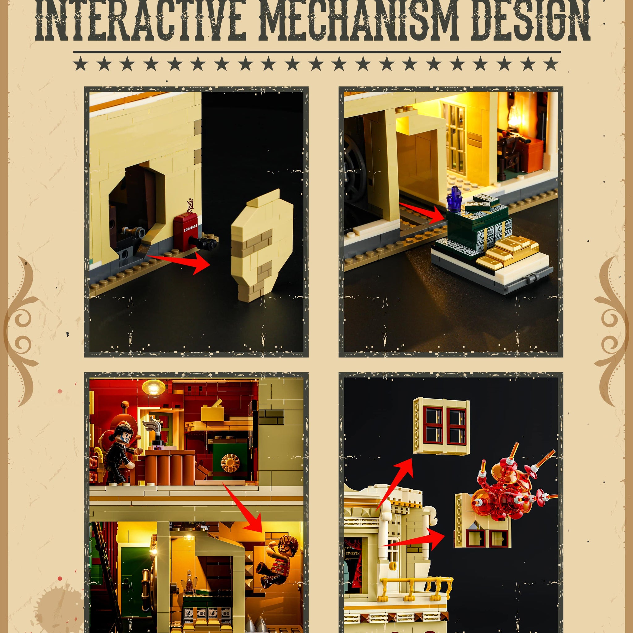 Realistic explosion lighting and interchangeable windows recreate the bank heist scene; ingenious mechanical structures enable dual gameplay modes—blasting walls and triggering traps—faithfully recreating the thrilling standoff between robbers and bank security.