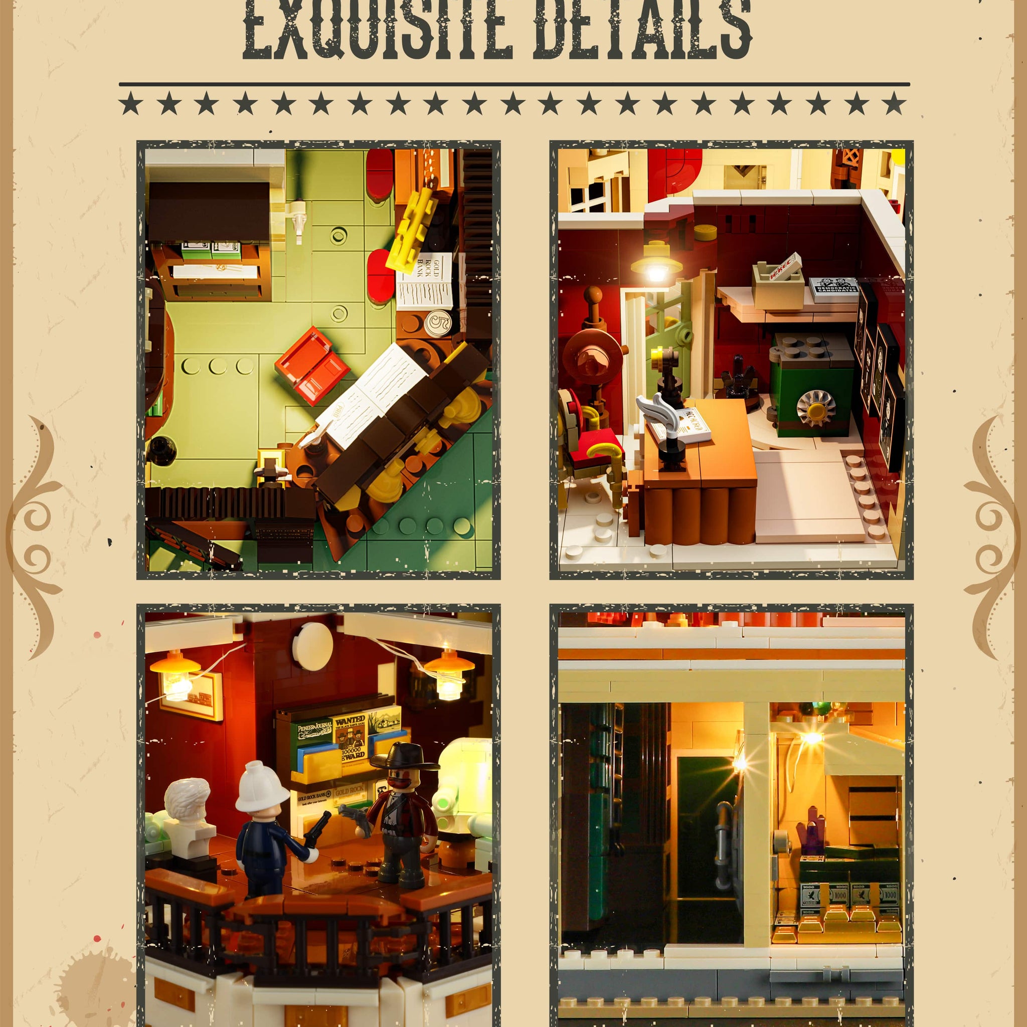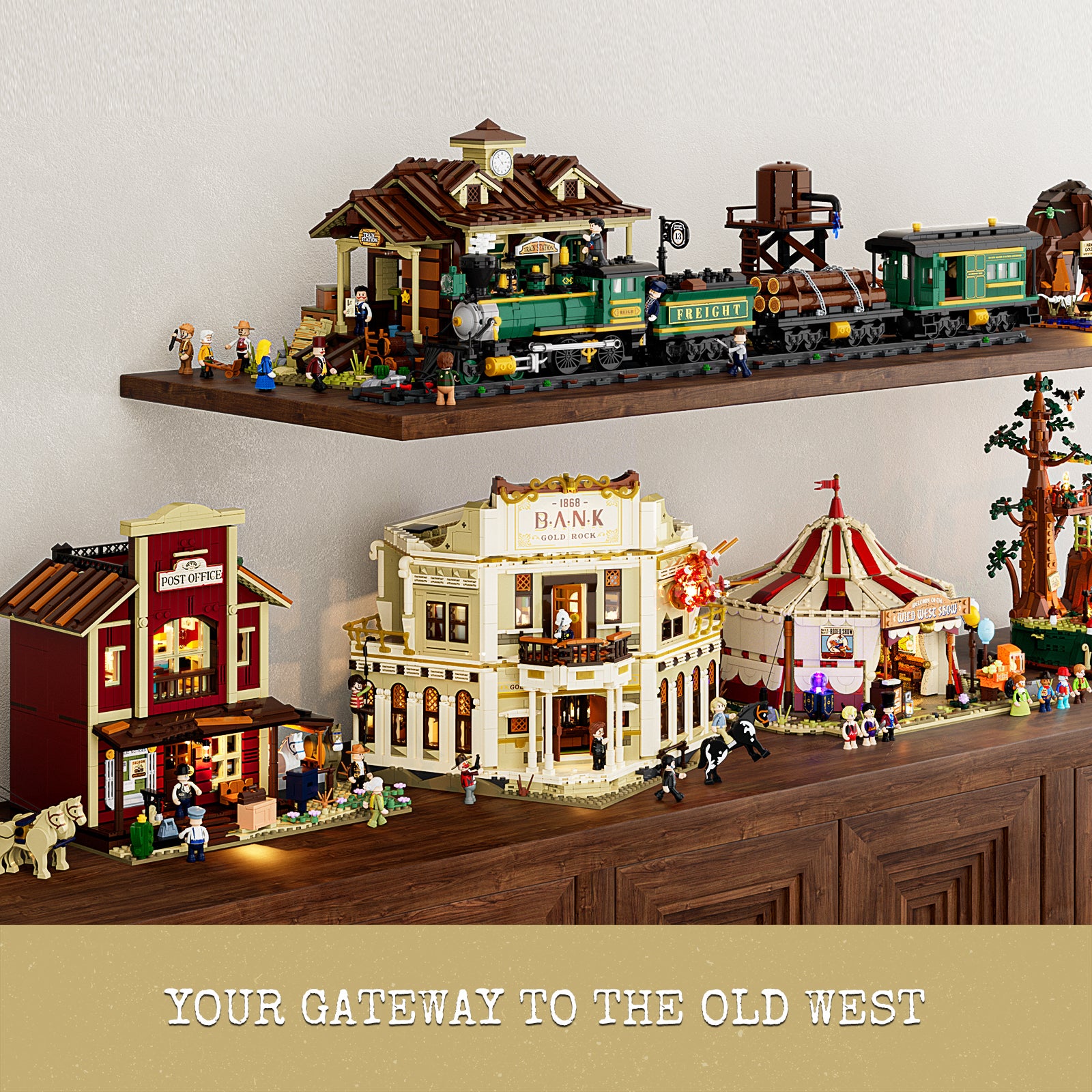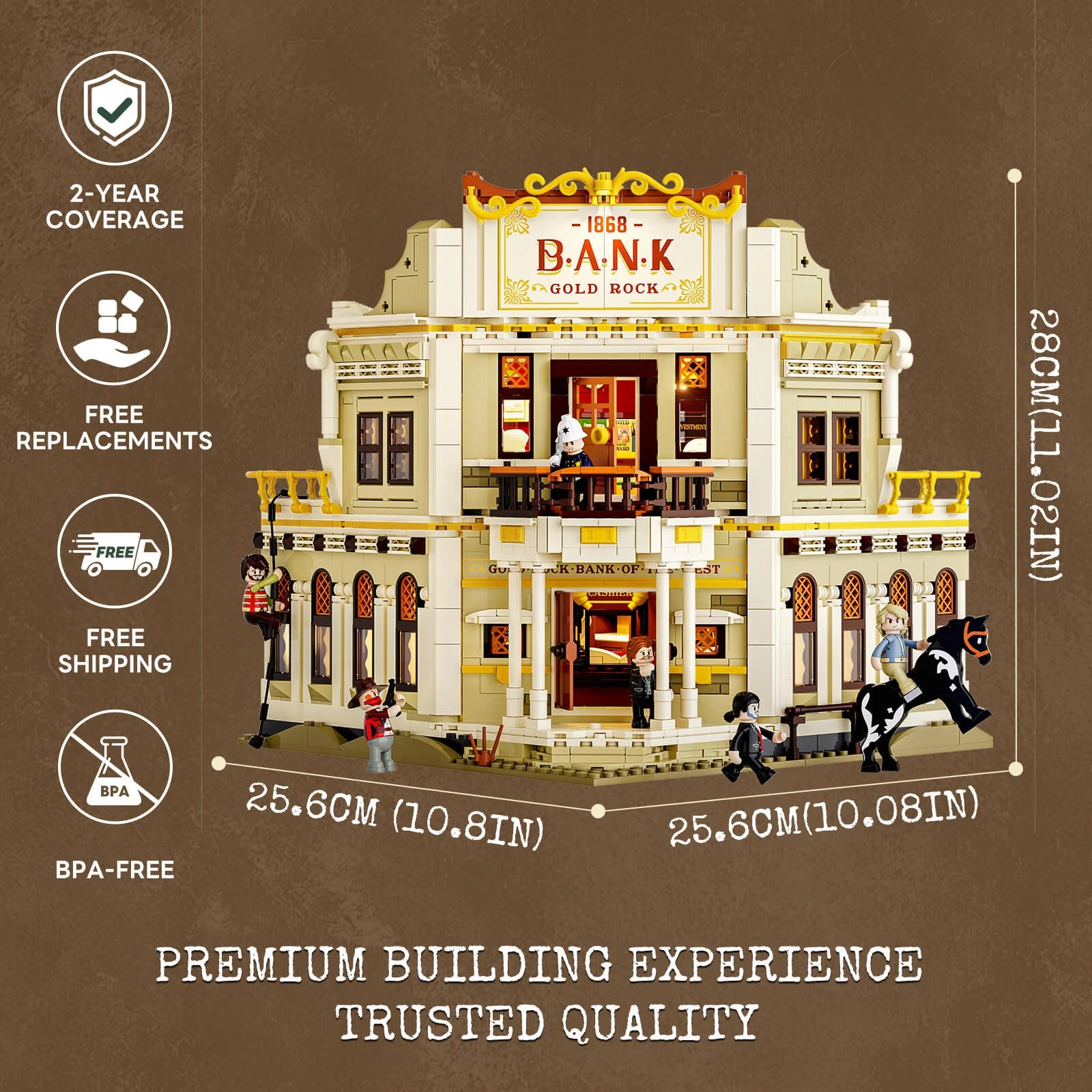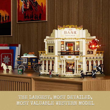 A premium build with 2,875 pieces and 11 LED lights, recreating a Western-town bank façade with realistic stone textures and textured finishes.