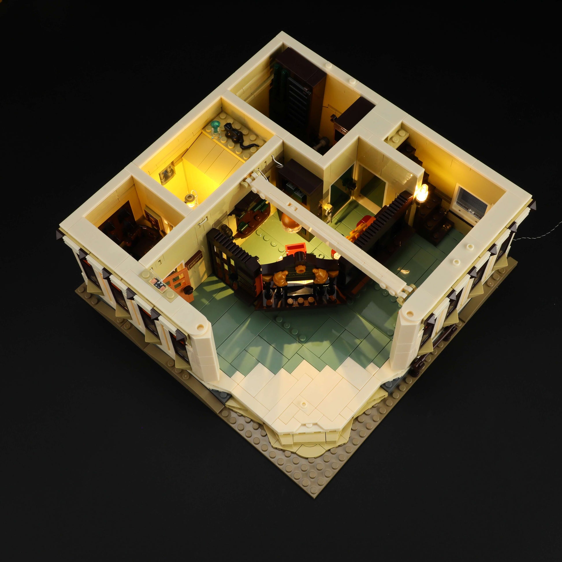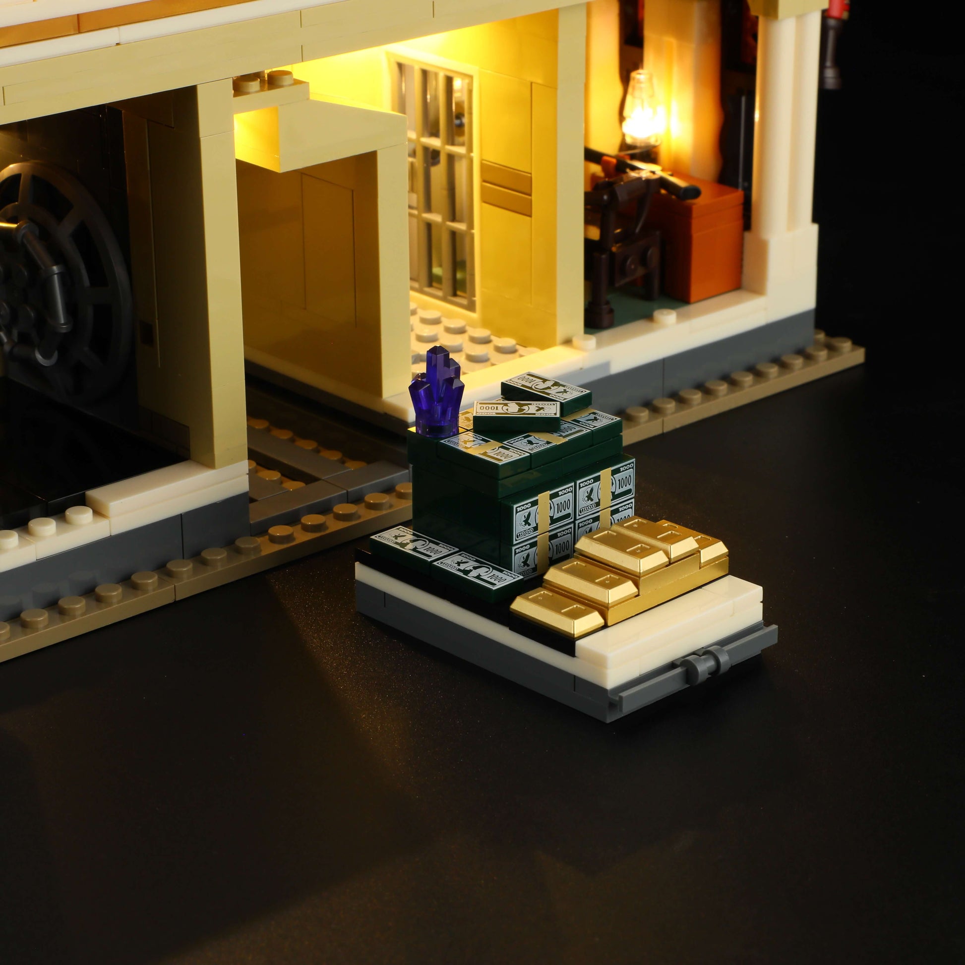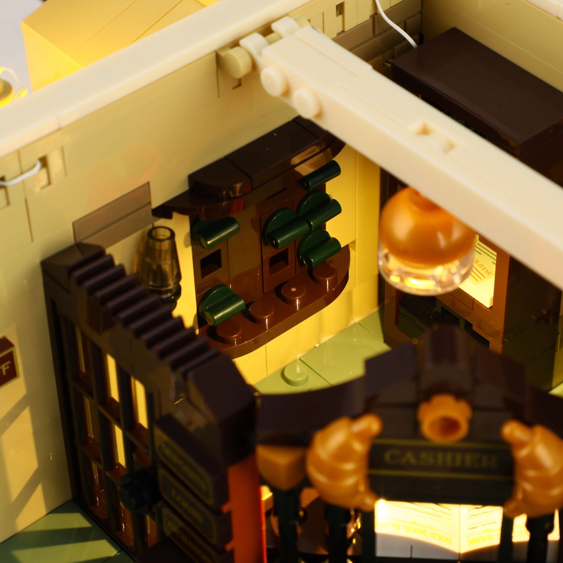 A premium build with 2,875 pieces and 11 LED lights, recreating a Western-town bank façade with realistic stone textures and textured finishes.